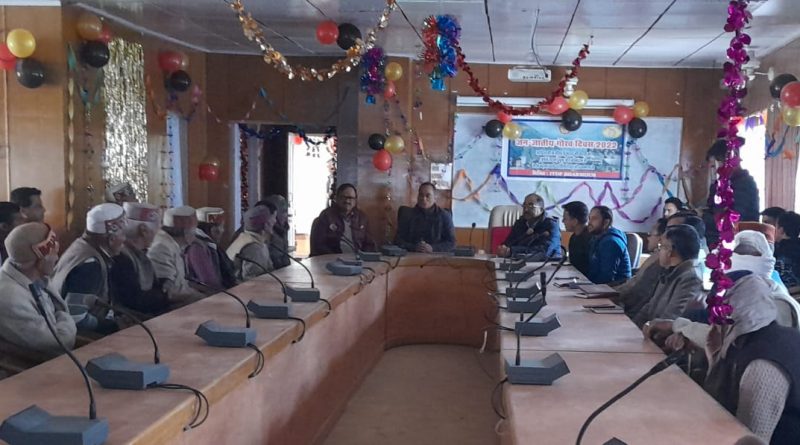 जनजातीय गौरव दिवस के चौथे दिन आज लघु सचिवालय पट्टी कार्यालय कक्ष में गोष्ठी का आयोजन किया गया। गोष्ठी में भरमौर के प्रबुद्ध नागरिकों ने जनजातीय लोक संस्कृति और जनजातीय परंपरा पर आधारित विषयों पर विचार विमर्श किए। इस अवसर पर एसडीएम भरमौर आसीम सूद ने कहा कि जनजातीय गौरव दिवस के उपलक्ष पर इस गोष्ठी के आयोजन का मुख्य उद्देश्य जनजातीय क्षेत्र की परंपराओं, लोक संस्कृति, और रीति-रिवाजों को उजागर करना है। उन्होंने गोष्ठी में भाग ले रहे प्रबुद्ध नागरिकों का धन्यवाद भी किया। प्रबुद्ध नागरिकों ने अपनी परंपराएं विचार एवं संस्कृति और अनुभव को सांझा किया। चर्चा में लोगों ने कहा कि अब समय के साथ बदल रहे परंपरागत व्यवसाय ,खानपान ,पहनावे, भाषा- बोलियां और लोकाचार में बदलाव के दृष्टिगत भावी पीढ़ी को इसके संरक्षण और संवर्धन को लेकर सकारात्मक प्रतिक्रिया दिखाना बेहद जरूरी है