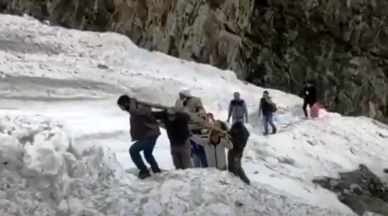 भरमौर का डल्ली सांह सड़क मार्ग गलेशियर आने के कारण बन्द पालकी पर ढोए जा रहे मरीज